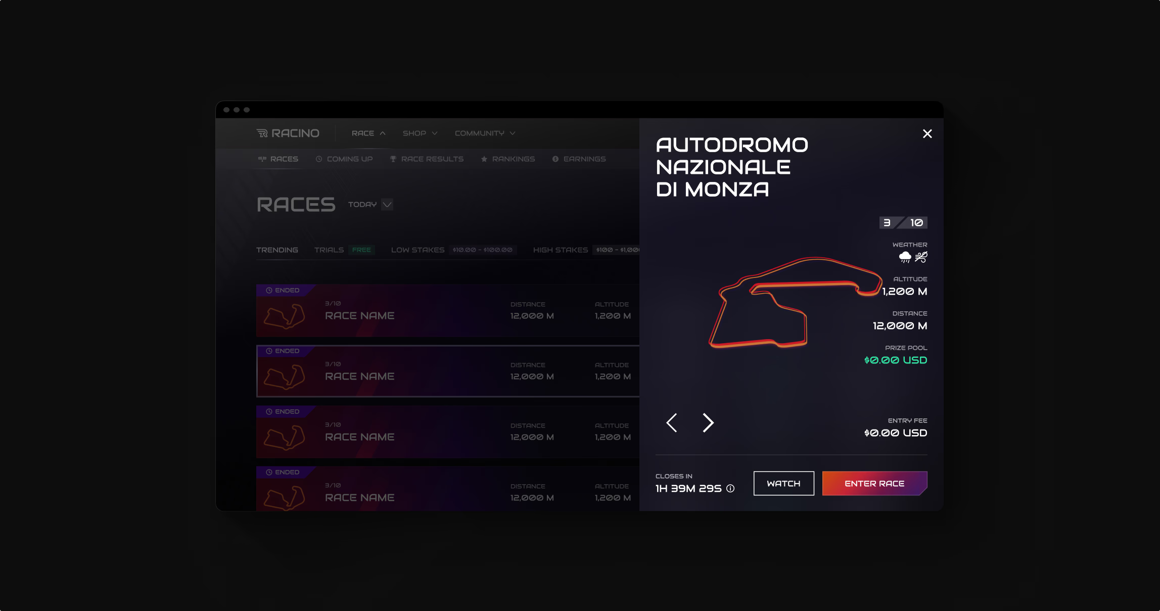 snapshot of race page for racino virtual Web3 racing platform Redesign Project.