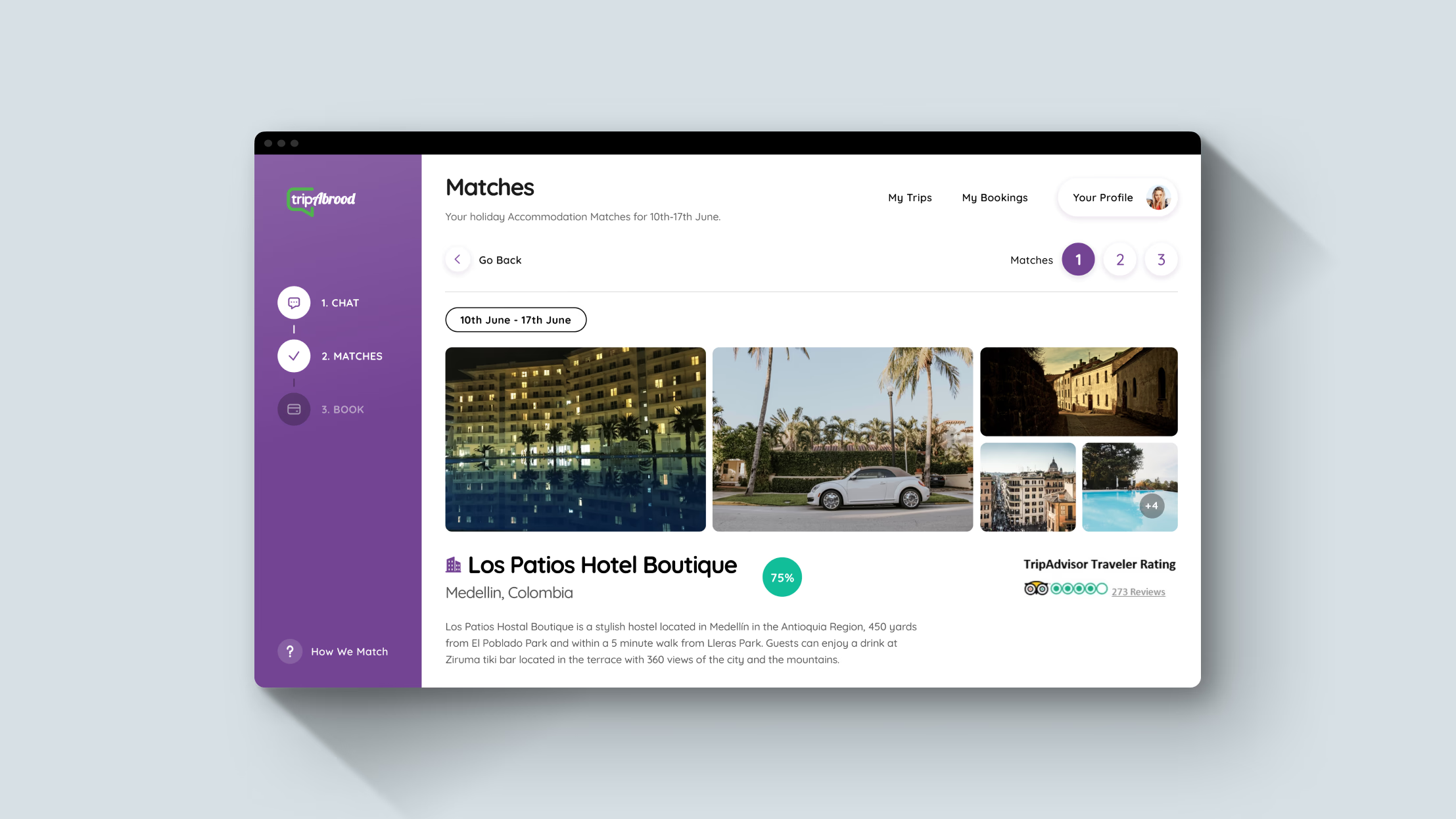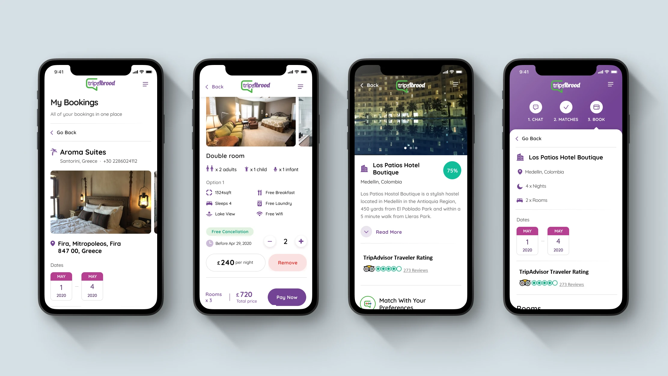 Snapchat of a few key screens for tripabrood, ai powered family accommodation booking platform.
