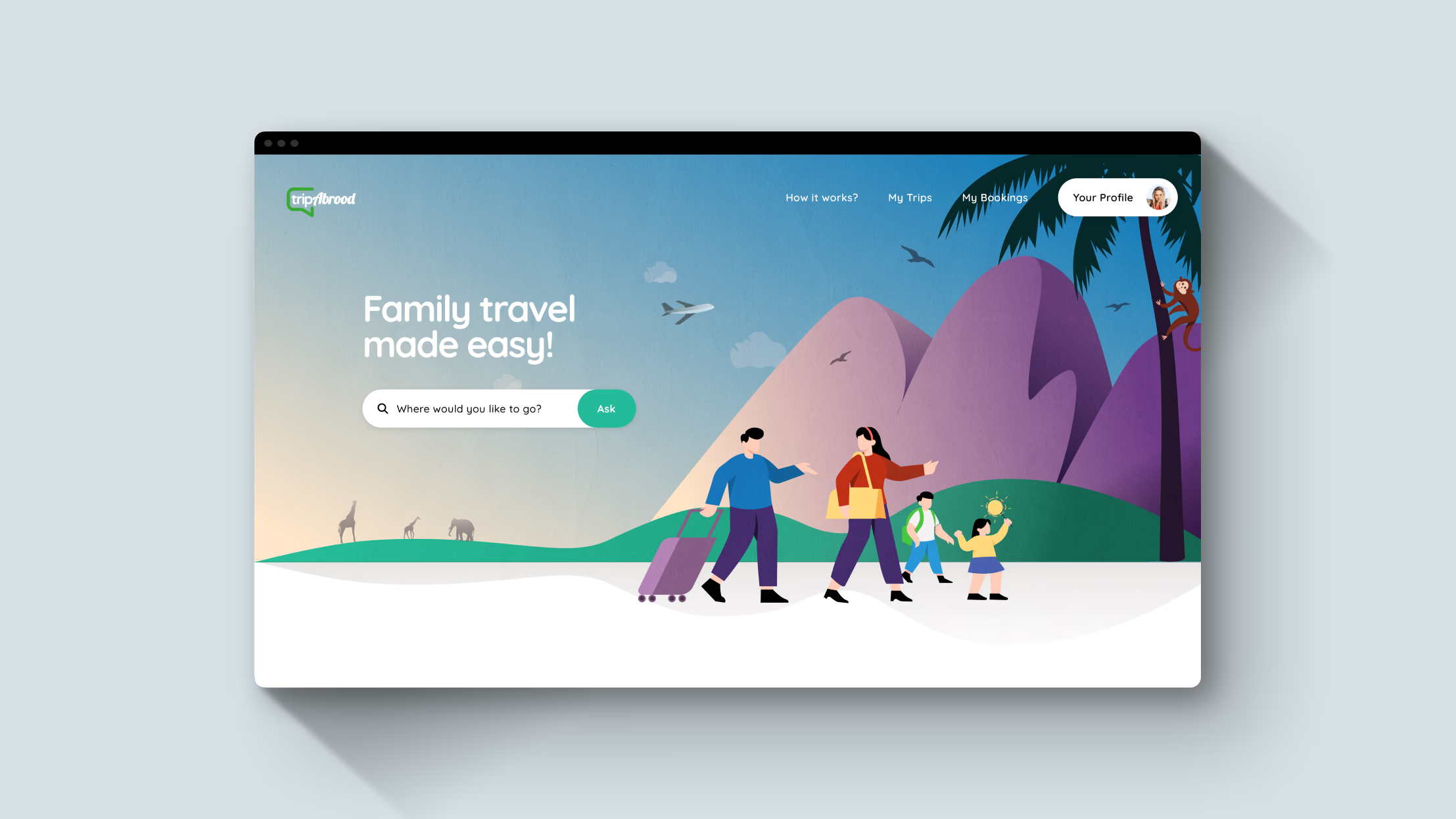 home page design for tripabrood, ai powered family accommodation booking platform.